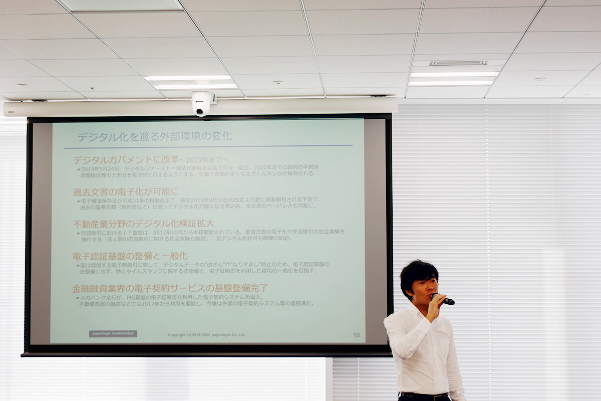 2019年7月31日(水)、EY ベンチャーアカデミーのIPO準備を体系的に学ぶ『事例紹介!IPO実務講座』内にて代表横山が講演を行いました。主催者様から来場者が写り込まないようにとのご指示で、満員の会場の熱気が伝わらない写真で恐縮ですが、約1時間にわたりIPOをお考えの企業へ向けて文書を電子化(ペーパーレス化)するメリットについて、内部統制確保の視点から解説させていただきました。