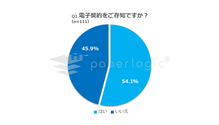 『「電子契約」をご存知ですか?』と質問したところ、「はい」が54.1%、「いいえ」が45.9%と、東京にある企業に勤めていても、半数近くが「電子契約」を知らないことがわかりました。