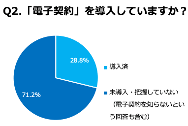 次に『「電子契約」を導入していますか?』と質問したところ、特定部門単位での部分導入を含み「導入済み」が28.8%、「未導入・把握していない(電子契約を知らないという回答も含む)」が71.2%と、7割の企業が電子契約についてまだ導入していないことが明らかになりました。