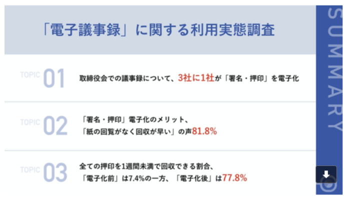今回の調査では、 取締役会での議事録について、 「署名・押印」の電子化が導入されている企業が多いとは言えないものの、 導入されている企業からは、 時間の短縮や、 ストレスの軽減など、 多くのメリットを実感していることが判明しました。 導入されていない企業からは、 電子化を希望する割合が圧倒的に高い状況です。 コロナ禍によってテレワークが進み、 出社する機会が減少している昨今において、 議事録の電子化は、 作業効率化に大きなインパクトを与えると言えるでしょう。 |