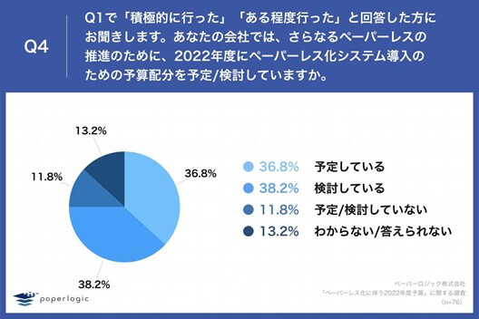 「Q4.Q1で「積極的に行った」「ある程度行った」と回答した方にお聞きします。あなたの会社では、さらなるペーパーレスの推進のために、2022年度にペーパーレス化システム導入のための予算配分を予定/検討していますか。」(n=76)と質問したところ、「予定している」が36.8%、「検討している」が38.2%という回答となりました。