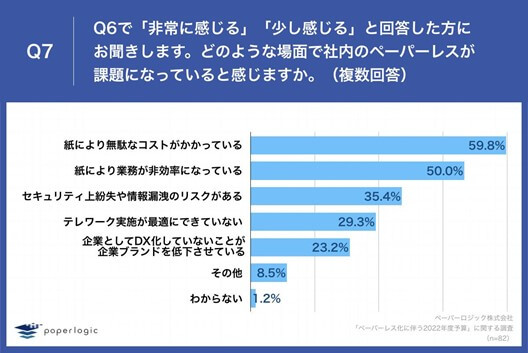 「Q7.Q6で「非常に感じる」「少し感じる」と回答した方にお聞きします。どのような場面で社内のペーパーレスが課題になっていると感じますか。(複数回答)」(n=82)と質問したところ、「紙により無駄なコストがかかっている」が59.8%、「紙により業務が非効率になっている」が50.0%、「セキュリティ上紛失や情報漏洩のリスクがある」が35.4%という回答となりました。