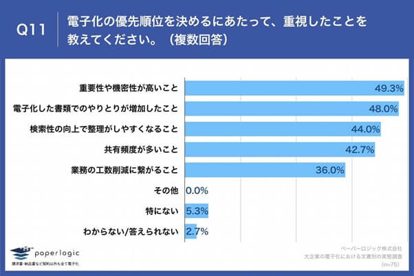 Q10で「特にない」「わからない/答えられない」以外を回答した方、「Q11.電子化の優先順位を決めるにあたって、重視したことを教えてください。(複数回答)」(n=75)と質問したところ、「重要性や機密性が高いこと」が49.3%、「電子化した書類でのやりとりが増加したこと」が48.0%、「検索性の向上で整理がしやすくなること」が44.0%という回答となりました。