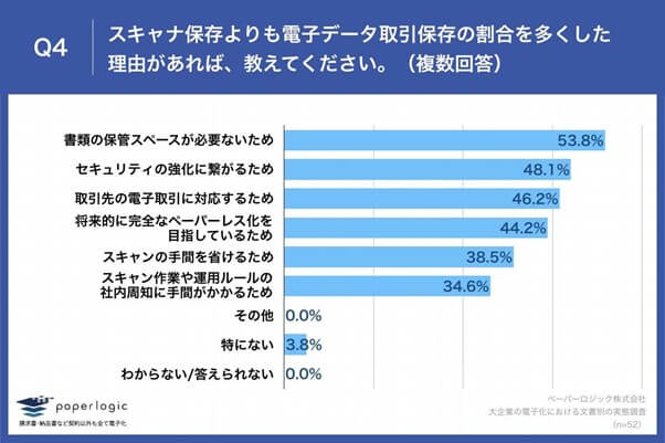 Q1で「領収書」かつ「電子データ取引保存のみ」「電子データ取引保存の方が多い」と回答した方に、「Q4.スキャナ保存よりも電子データ取引保存の割合を多くした理由があれば、教えてください。(複数回答)」(n=52)と質問したところ、「書類の保管スペースが必要ないため」が53.8%、「セキュリティの強化に繋がるため」が48.1%、「取引先の電子取引に対応するため」が46.2%という回答となりました。