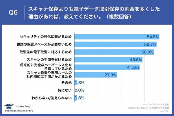 Q1で「納品書」かつ「電子データ取引保存のみ」「電子データ取引保存の方が多い」と回答した方に、「Q6.スキャナ保存よりも電子データ取引保存の割合を多くした理由があれば、教えてください。(複数回答)」(n=55)と質問したところ、「セキュリティの強化に繋がるため」が54.5%、「書類の保管スペースが必要ないため」が52.7%、「取引先の電子取引に対応するため」が50.9%という回答となりました。