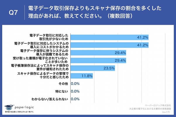 Q1で「納品書」かつ「スキャナ保存のみ」「スキャナ保存の方が多い」と回答した方に、「Q7.電子データ取引保存よりもスキャナ保存の割合を多くした理由があれば、教えてください。(複数回答)」(n=17)と質問したところ、「電子データ取引に対応した取引先が少ないため」が41.2%、「電子データ取引に対応したシステムの導入にコストがかかるため」が41.2%、「電子データ保存に伴うシステムの導入が困難であるため」が29.4%という回答となりました。