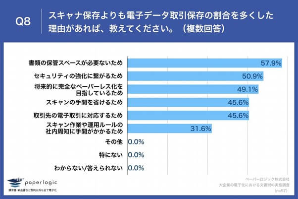 Q1で「契約書」かつ「電子データ取引保存のみ」「電子データ取引保存の方が多い」と回答した方に、「Q8.スキャナ保存よりも電子データ取引保存の割合を多くした理由があれば、教えてください。(複数回答)」(n=57)と質問したところ、「書類の保管スペースが必要ないため」が57.9%、「セキュリティの強化に繋がるため」が50.9%、「将来的に完全なペーパーレス化を目指しているため」が49.1%という回答となりました。