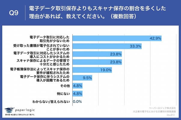 Q1で「契約書」かつ「スキャナ保存のみ」「スキャナ保存の方が多い」と回答した方に、「Q9.電子データ取引保存よりもスキャナ保存の割合を多くした理由があれば、教えてください。(複数回答)」(n=21)と質問したところ、「電子データ取引に対応した取引先が少ないため」が42.9%、「受け取った書類が電子化されていないことが多いため」が33.3%、「電子データ取引に対応したシステムの導入にコストがかかるため」が23.8%という回答となりました。