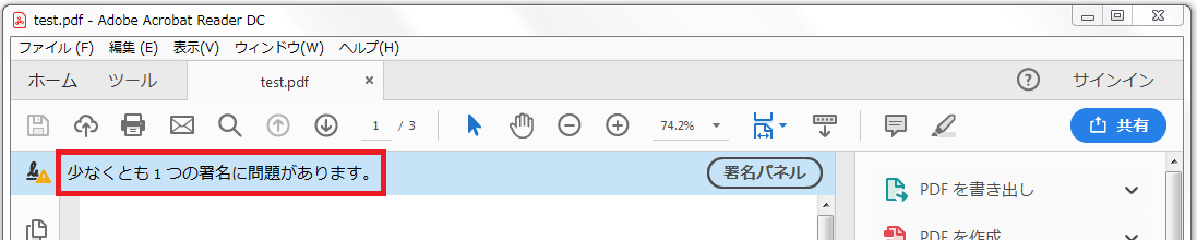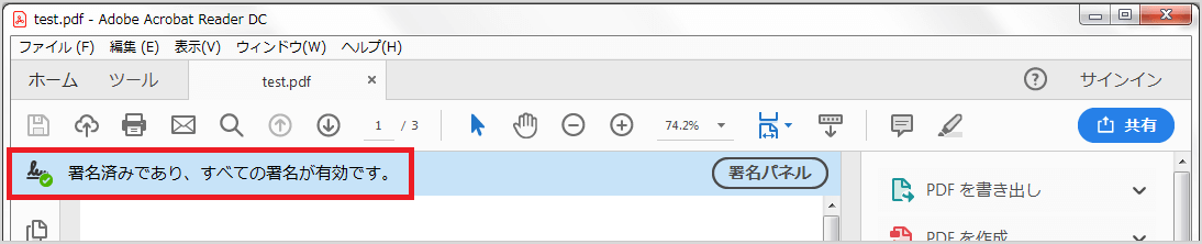 Adobe Acrobat Readerで電子署名付きPDFを閲覧すると、「署名済みであり、すべての署名が有効です。」と表示されるようになります。(下図)