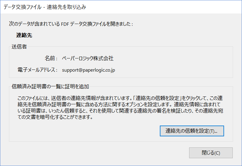 2)Adobe Acrobat Reader が立ち上がり、下図のようなポップアップウィンドウ(「データ交換ファイル – 連絡先を取込み」)が立ち上がります。