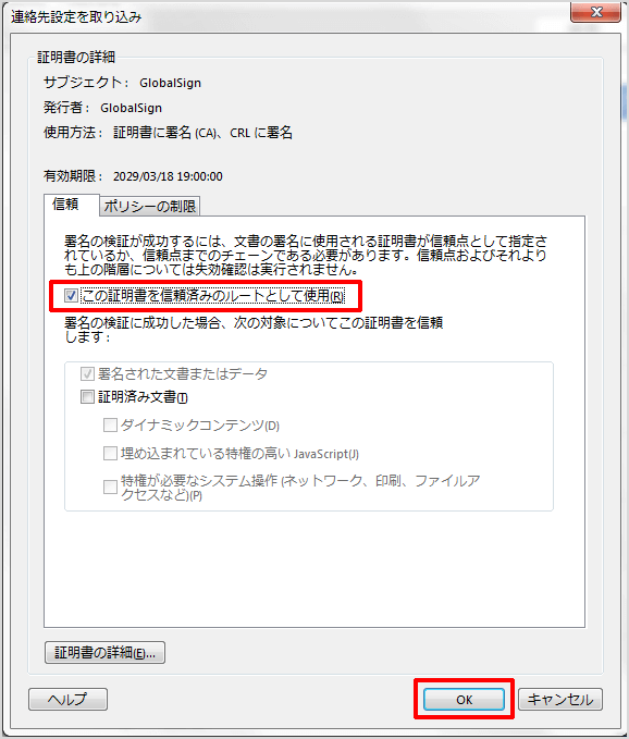 ルート証明書の設定を行うと電子署名の検証ができます。