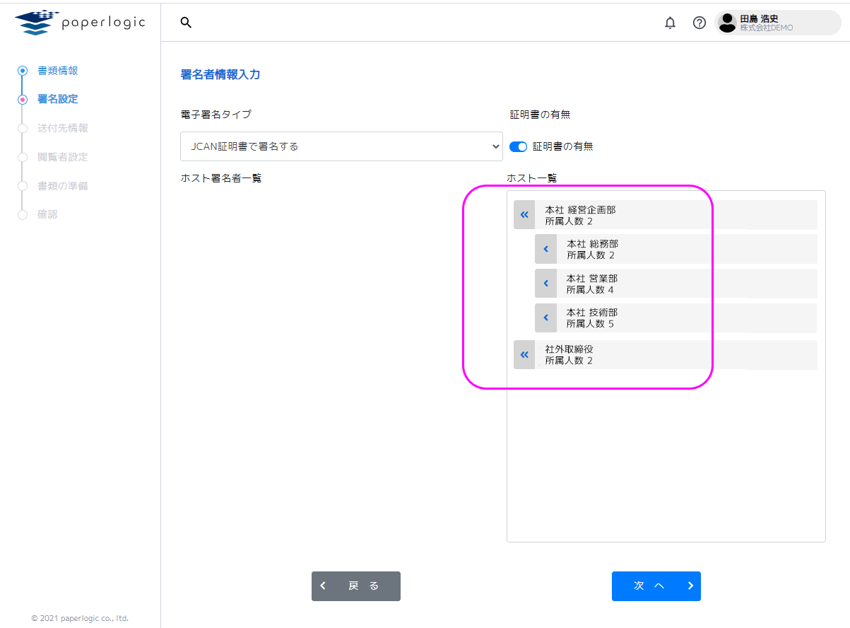 署名者を一覧(下図の角丸四角箇所)から選びます。社外取締役やグループ会社はホスト側でもゲスト側でも運用可能(他の書類の閲覧権限等に鑑みて設定)